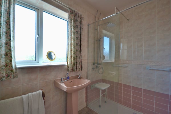 6' 02" x 13' 09" max(1.88m x 4.19m) Laminate flooring, tiled walls, window to rear aspect, large rectangular walk in shower tray thermostatic rainfall shower over, low level flush w/c, hand basin,radiator