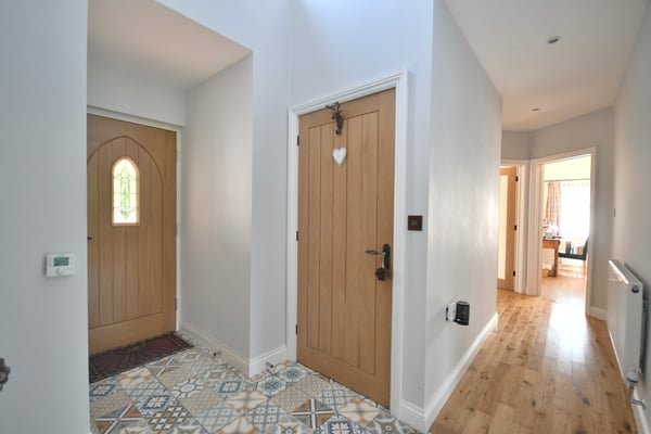 Solid door to front, full height hallway, part tiled flooring and part wooden flooring, access to loft, storage cupboard and radiator.