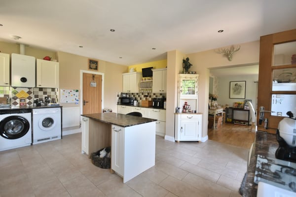 16' 8" x 17' 8" (5.08m x 5.38m) Double glazed door to side, double glazed window to front and side, fitted kitchen with integrated double oven, integrated hob with extractor above, ceramic sink, space for washing machine, tumble dryer and dishwasher, gas central heating, storage cupboard, radiators and tiled flooring.