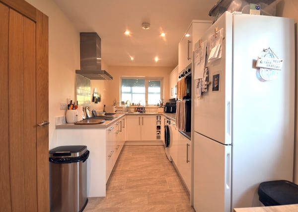 7' 02" x 21' 04" (2.18m x 6.50m) Tiled flooring, range of base and wall cabinets, worktops, inset steel sink with mixer tap over, window to front aspect, space for fridge freezer, space for washing machine, radiator, window to side aspect, integrated induction hob with extractor over, double oven with grill, integrated dishwasher