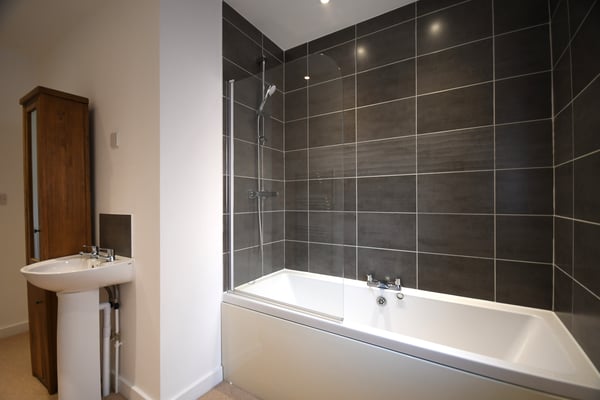 10' 06" x 8' 06" (3.20m x 2.59m) Carpeted, window to side aspect, standard panelled bath with thermostatic shower over with shower screen, low level flush w/c, hand basin, towel radiator