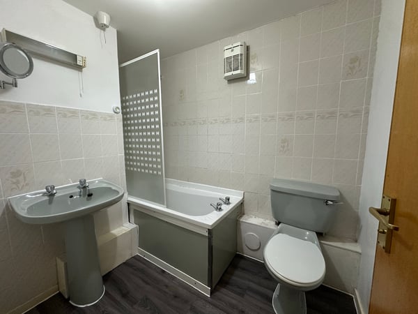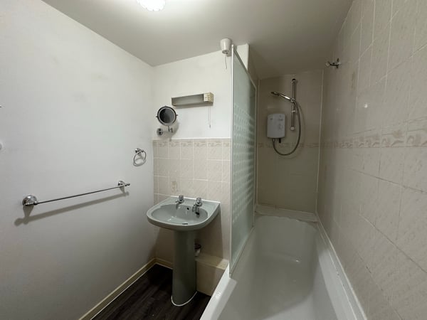 Bath with shower over, Low level WC and pedestal wash hand basin.