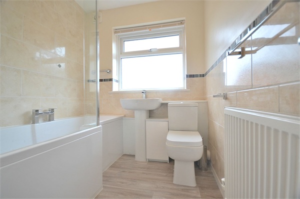 A bathroom suite comprising of L shaped bath with power shower over head, radiator, low flush Wc and pedestal wash hand basin.