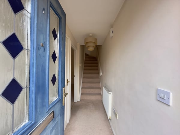 Window to front, under stairs storage cupboard, radiator, television point.