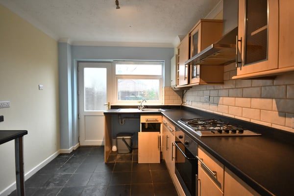 10' 08" x 8' 10" (3.25m x 2.69m) Tiled flooring, range of base and wall cabinets, gas cooker with gas hob over, extractor above, steel sink with mixer tap over, pantry under stairs cupboard, door to rear garden