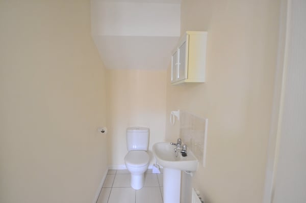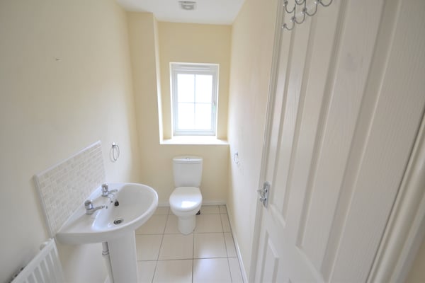 Fitted shower cubicle, fully tiled with thermostatic shower, pedestal wash hand basin, low level WC, tiled floor, tiled splashbacks and Upvc double glazed window to front.