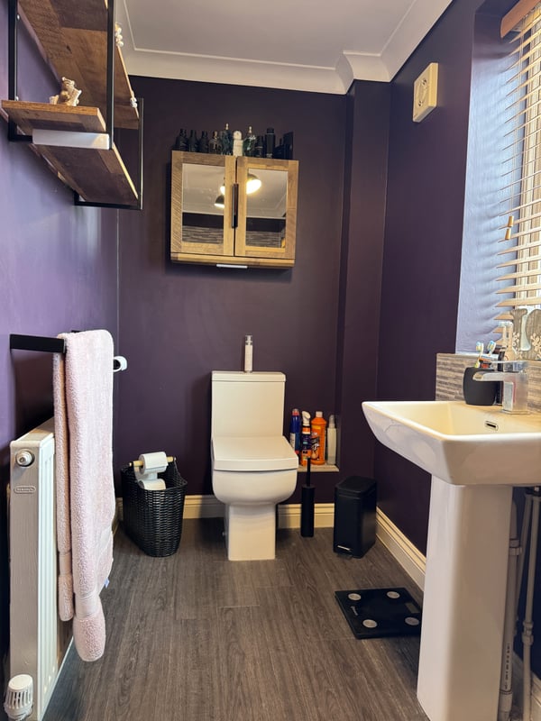 3.38m x 1.72m (11' 1" x 5' 8") (max to recess) UPVC double glazed window to front aspect, WC, hand wash basin, bath with hot and cold mixer tap and wall mounted shower head, tiled splash back, oak effect flooring, radiator.