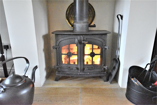 21' x 13' 13" (6.40m x 4.29m) Cast iron log burner inset to fireplace, exposed ceiling timbers, dual aspect room with window to front and full length glazed windows and door to rear patio area, ceramic tiled floor and two radiators.