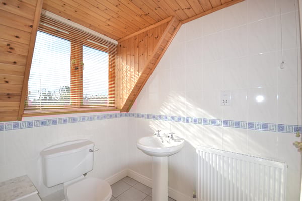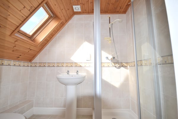 Three piece suite comprising of walk in shower with power shower, low level WC and pedestal wash hand basin, ceramic tiled floor and Velux window to rear.