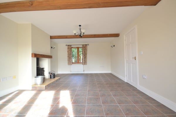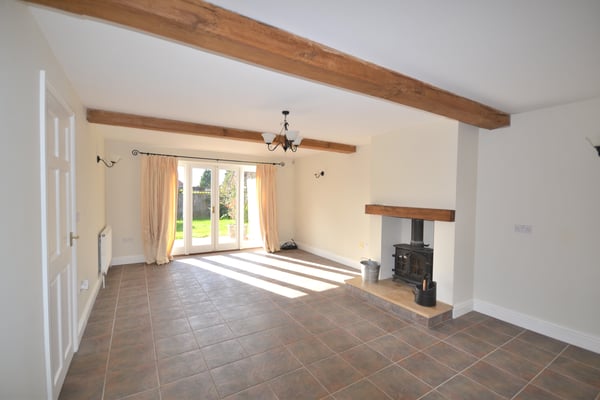 21' x 13' 13" (6.40m x 4.29m) Cast iron log burner inset to fireplace, exposed ceiling timbers, dual aspect room with window to front and full length glazed windows and door to rear patio area, ceramic tiled floor and two radiators.