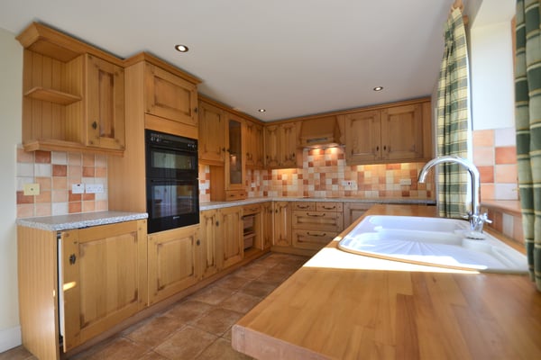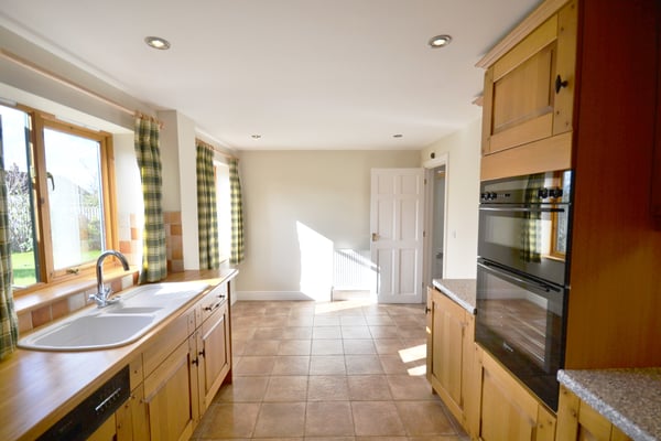 18' 6" x 9' 3" (5.64m x 2.82m) Fitted kitchen, solid oak construction with integrated dishwasher and fridge, extractor hood over four ring induction hob, high level electric double oven, space for upright fridge freezer, ceramic tiled floor, windows to rear aspect, access to utility room.