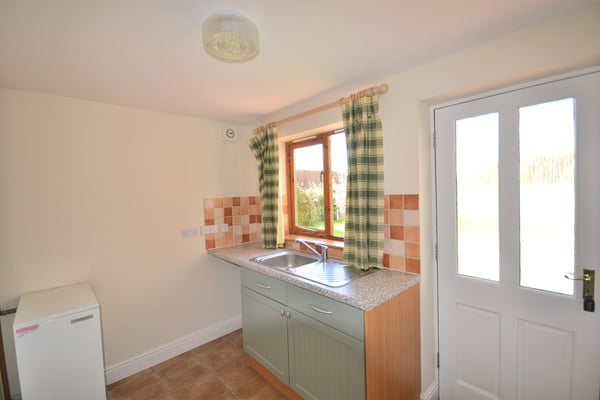 Oil fired boiler providing heating and hot water, worktop with storage cupboards, plumbing for washing machine, ceramic tiled floor, window to side and access to rear garden, patio area and access to garage.