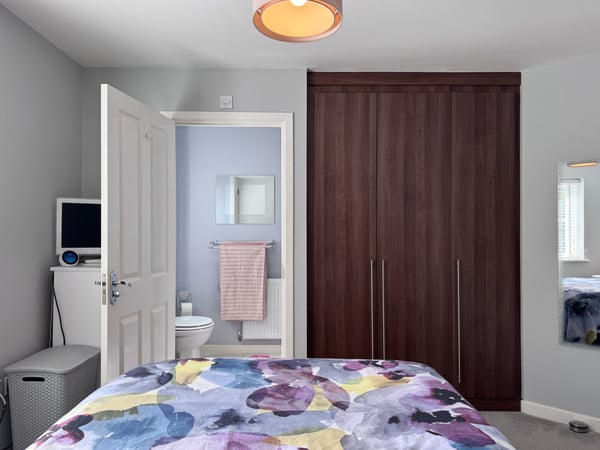UPVC double glazed obscured window to rear aspect, thermostatic shower with folding door, hand wash basin with hot and cold taps, W.C, radiator and shaving point, part tiled walls.