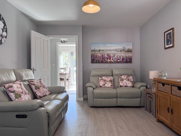 UPVC double glazed patio doors and windows to rear aspect leading to garden. Oak effect LVT flooring, range of matching base and wall units, work top with stainless sink and drainer and hot and cold mixer tap, integrated four ring gas hob with extractor above, integrated electric oven, space and plumbing for washing machine, space for fridge freezer, space for dining table and chairs, radiator.