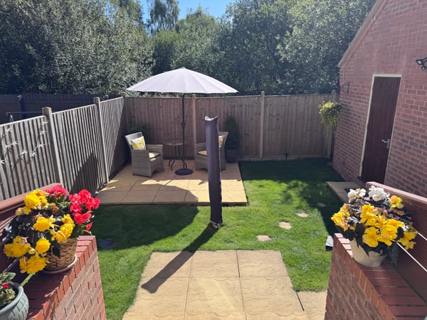 Predominately laid to lawn with patio area, steps leading to patio doors, gated access to the front of the property, personal door to garage, fully enclosed.