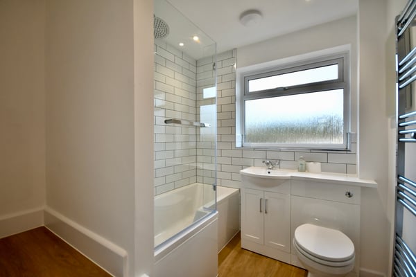 7' 4" x 6' 6" (2.24m x 1.98m) Double glazed window to front, panel bath with mixer shower above, vanity combination unit with w/c and sink, towel radiator and LVT flooring.