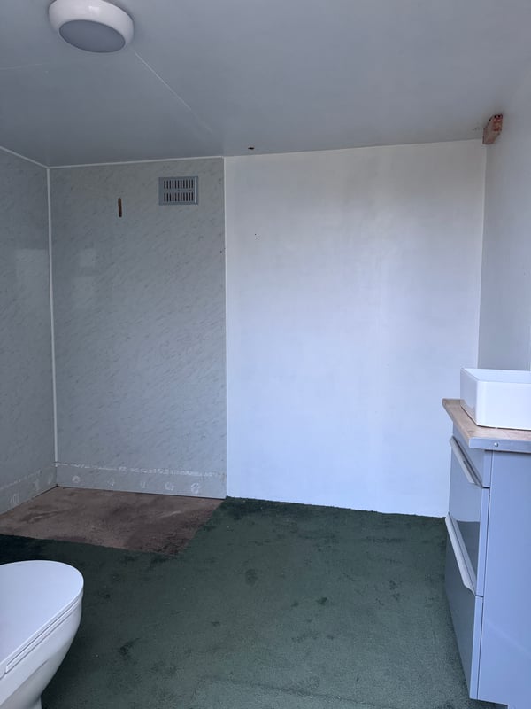 2.55m x 1.47m (8' 4" x 4' 10") UPVC double glazed window to side aspect, WC, electric power shower, vanity unit with hand wash basin to be fitted.