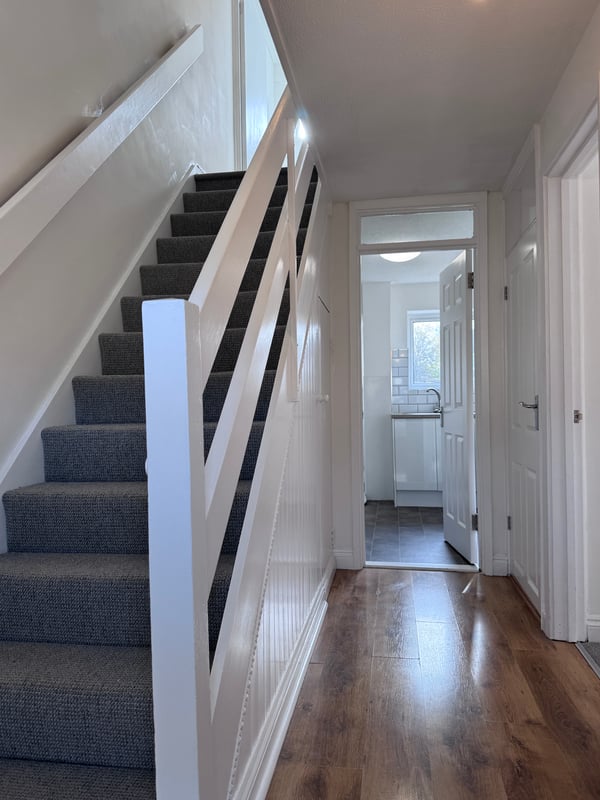 3.75m x 1.97m (12' 4" x 6' 6") UPVC double glazed doors and window to front aspect, oak effect laminate flooring, radiator, under stair storage, stairs to first floor, built in storage, doors to -