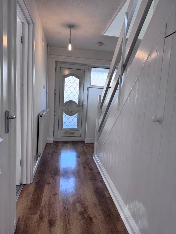 3.75m x 1.97m (12' 4" x 6' 6") UPVC double glazed doors and window to front aspect, oak effect laminate flooring, radiator, under stair storage, stairs to first floor, built in storage, doors to -