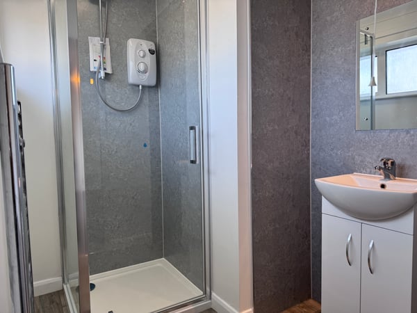 2.12m x 1.68m (6' 11" x 5' 6") (max to recess) UPVC double glazed window to front aspect, vanity unit with inset hand wash basin, electric power shower, heated towel rail, oak effect vinyl flooring.