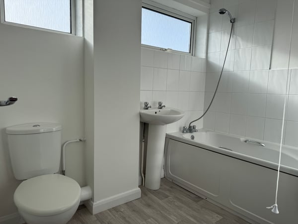 2.45m x 1.67m (8' 0" x 5' 6") UPVC double glazed windows to rear aspect, WC, hand wash basin, bath with hot and cold mixer tap, tiled splash back, oak effect vinyl flooring.