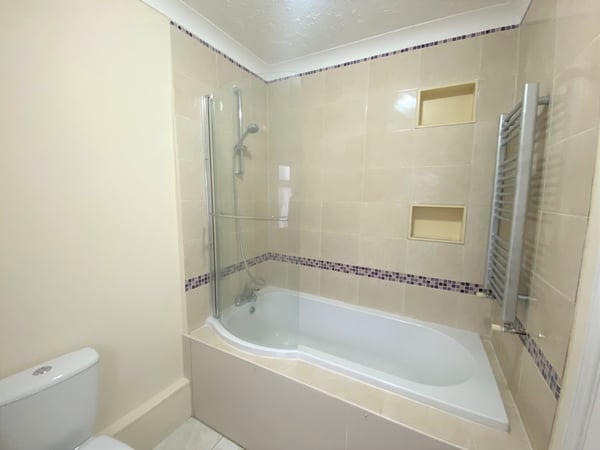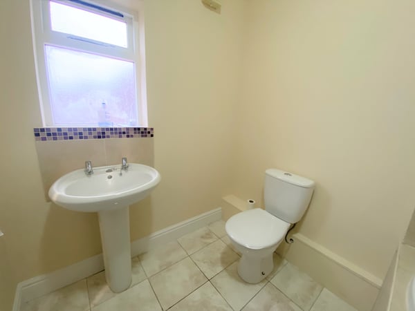 A three piece suite consisting of P shaped bath with mixer shower function, low flush W.C. pedestal wash hand basin & towel radiator, tiled flooring and window to rear.