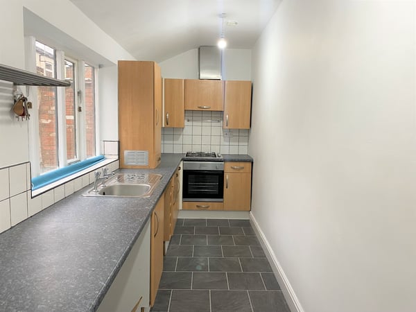 Vinyl flooring with fitted wall & base units, oven, hob & extractor, window to side, plumbing for washing machine.
