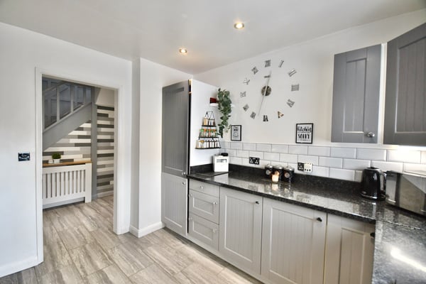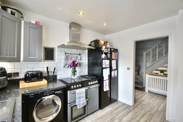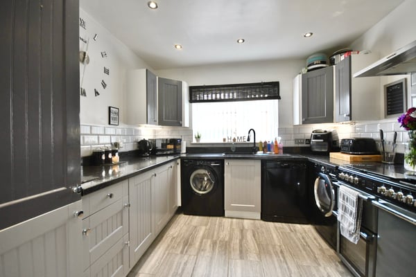 10' 2" x 9' 8" (3.10m x 2.95m) Double glazed window to front, fitted kitchen with space for range style cooker, space for washing machine, tumble dryer, fridge freezer and dishwasher, and tiled flooring.