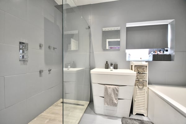 9' 2" x 6' 5" (2.79m x 1.96m) Double glazed window to side, panel bath, shower enclosure with mixer shower, sink with vanity unit, towel radiator and tiled flooring.