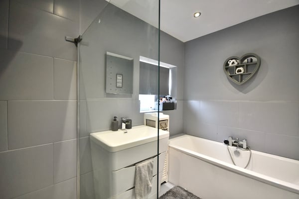 9' 2" x 6' 5" (2.79m x 1.96m) Double glazed window to side, panel bath, shower enclosure with mixer shower, sink with vanity unit, towel radiator and tiled flooring.
