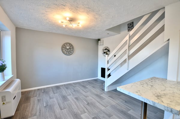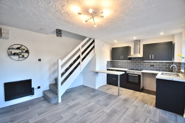12' 3" x 16' 3" (3.73m x 4.95m) Fitted kitchen with integrated oven, hob and extractor, storage cupboard housing hot water tank, two double glazed windows to front, two electric radiators and vinyl flooring.