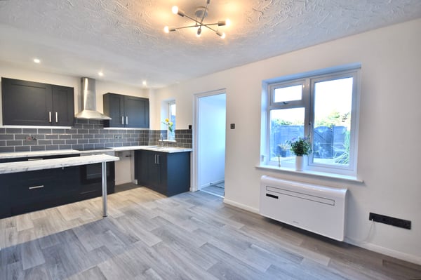 12' 3" x 16' 3" (3.73m x 4.95m) Fitted kitchen with integrated oven, hob and extractor, storage cupboard housing hot water tank, two double glazed windows to front, two electric radiators and vinyl flooring.