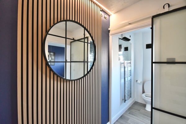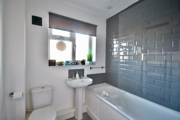 6' 0" x 6' 8" (1.83m x 2.03m) Double glazed window to front, panel bath with electric shower above, pedestal wash hand basin, low flush w/c, electric towel rail and vinyl flooring.