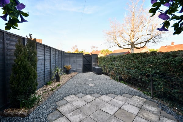 A low maintenance garden mainly laid to shingle with a patio area and mature borders.
