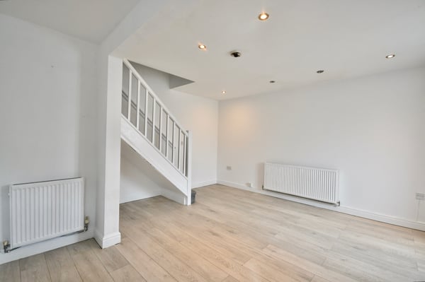14' 6" x 17' 3" (4.42m x 5.26m) Double glazed door and window to front, fitted kitchen with oven and hob with extractor above, space for washing machine, two radiators, gas central heating boiler and laminate flooring.