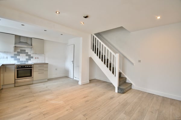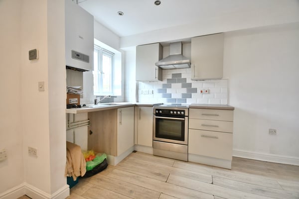 14' 6" x 17' 3" (4.42m x 5.26m) Double glazed door and window to front, fitted kitchen with oven and hob with extractor above, space for washing machine, two radiators, gas central heating boiler and laminate flooring.