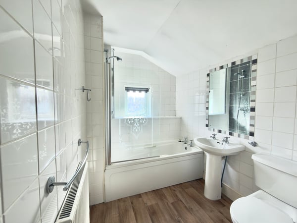 A three piece fully tiled suite comprising of bath with shower over, pedestal wash hand basin, low level WC, airing cupboard, vinyl flooring, radiator and window to rear.