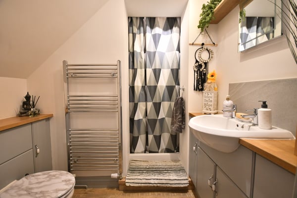 7' 08" x 8' 00" (2.34m x 2.44m) vinyl flooring, standard panelled bath with tiled surround, mixer tap and separate shower attachment, shower cubicle, towel radiator, low level flush w/c, hand basin, window to rear aspect