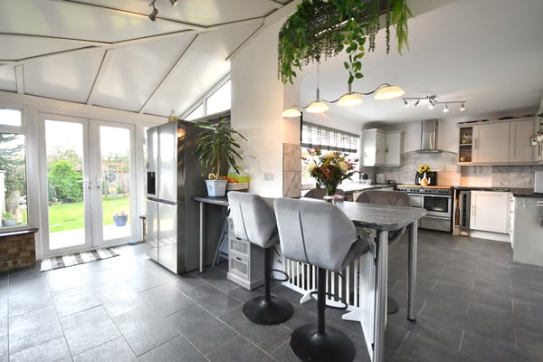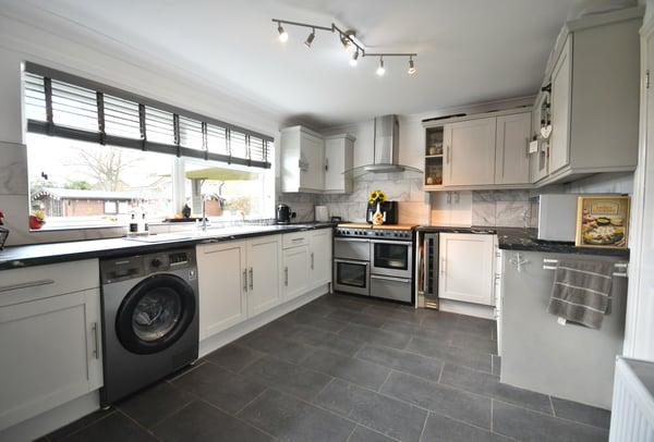 13' 08" x 10' 00" (4.17m x 3.05m) Tiled flooring, window to rear aspect, a range of base and wall cabinets with worktops over, ceramic sink with mixer tap over,space for range style cooker, space for washing machine, integrated wine cooler, breakfast bar, radiator