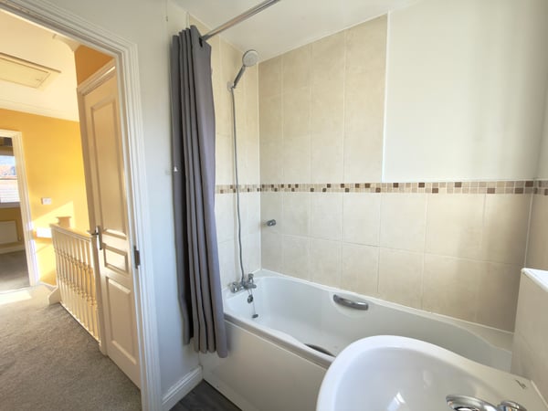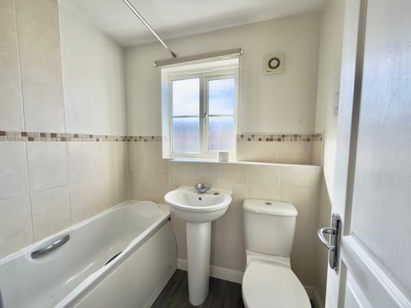 Vinyl flooring with fitted white suite comprising of bath with mixer tap shower over, low level WC, pedestal wash hand basin radiator and window to front.