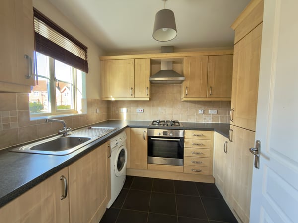 Fitted with a range of base and wall mounted storage cupboards, integrated oven and gas hob, vinyl flooring and window to front.