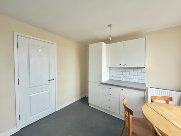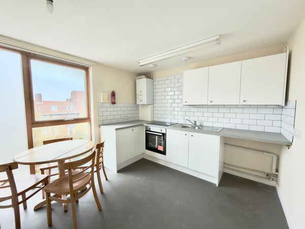 Fitted with a range of wall mounted and base storage units, electric hob and oven, space and plumbing for washing machine. Full wall height window to front and area for dining.
