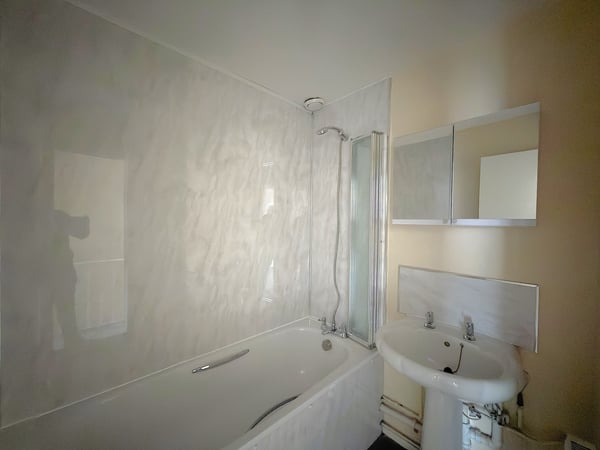 Bath with mixer tap shower function and pedestal wash hand basin.