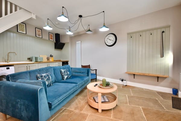 19' 01" max x 18' 02" max (5.82m x 5.54m) Entrance door, Limestone tiled flooring, stairs to first floor, storage cupboard, range of base cabinets, wooden worktops, ceramic sink with mixer tap over, space for fridge/freezer, space and plumbing for washing machine, oven with induction hob above, extractor, radiator, window to front and side aspect, stairs to first floor