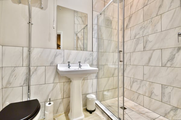 7' 05" x 8' 09" (2.26m x 2.67m) Porcelain tiled flooring with half surround, walk in shower enclosure with dual Rainfall shower heads, hand basin, towel radiator, high level flush w/c