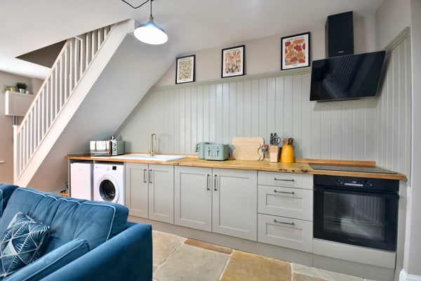 19' 01" max x 18' 02" max (5.82m x 5.54m) Entrance door, Limestone tiled flooring, stairs to first floor, storage cupboard, range of base cabinets, wooden worktops, ceramic sink with mixer tap over, space for fridge/freezer, space and plumbing for washing machine, oven with induction hob above, extractor, radiator, window to front and side aspect, stairs to first floor